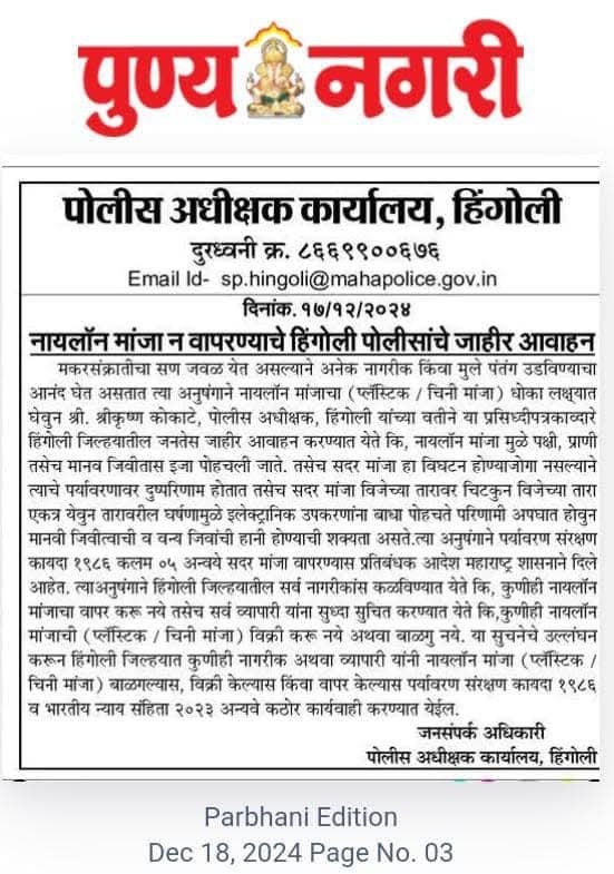नायलॉन मांजा न वापरण्याचे नागरिकांना आवाहन